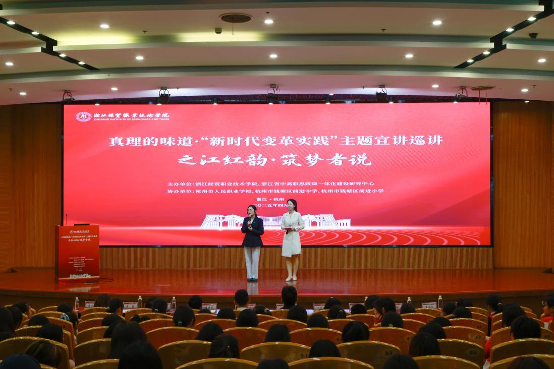 经贸学院宣传统战部、学生工作部、团委、马克思主义学院负责人及相关教师,杭州市人民职业学校、杭州市钱塘区前进中学、杭州市钱塘区前进小学师生代表,学校党校培训班学员、团校培训班学员、青马工程培训班学员等300余人现场聆听了宣讲报告。