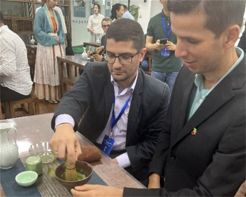 学习间隙,巴西学员与浙经贸师生代表共同进行了一场别开生面的跨文化对话。在茶香氤氲中,双方以“宋代点茶”非遗技艺为媒,共赴一场跨越千年的文化雅集。这场文化交融的盛宴,架起了中巴合作的文化桥梁,从研膏碾茶的手作之趣,到茶百戏绘制的东方美学,学员们在执盏点茶的仪式感中,触摸中国茶文化的肌理脉络,体悟东方管理哲学中的治理智慧。